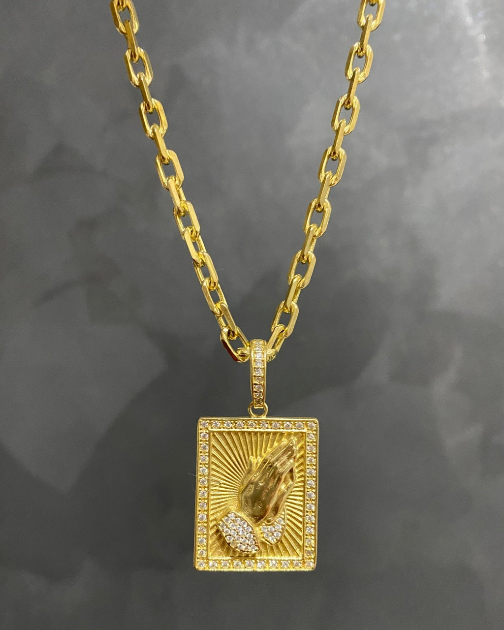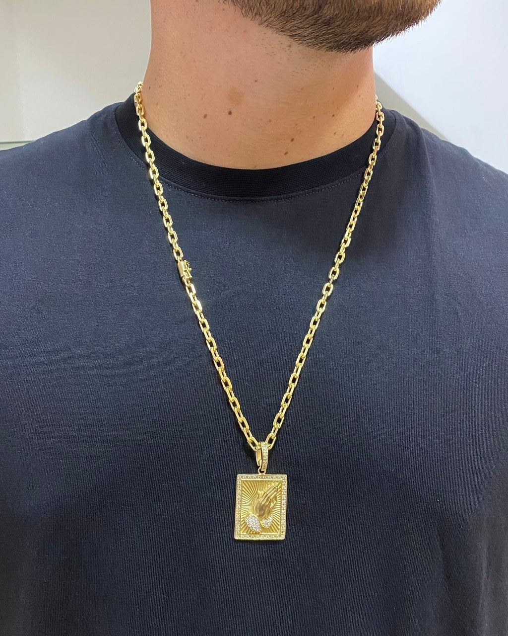 CORRENTE CADEADO DE QUINA 5MM + PINGENTE MÃO ORAÇÃO QUADRADO CRAVEJADO