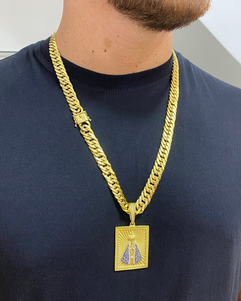 CORRENTE GRUMET LAMINADA 12MM + PINGENTE NOSSA SENHORA APARECIDA CRAVEJADO QUADRADO