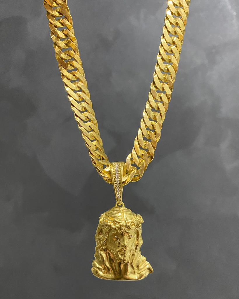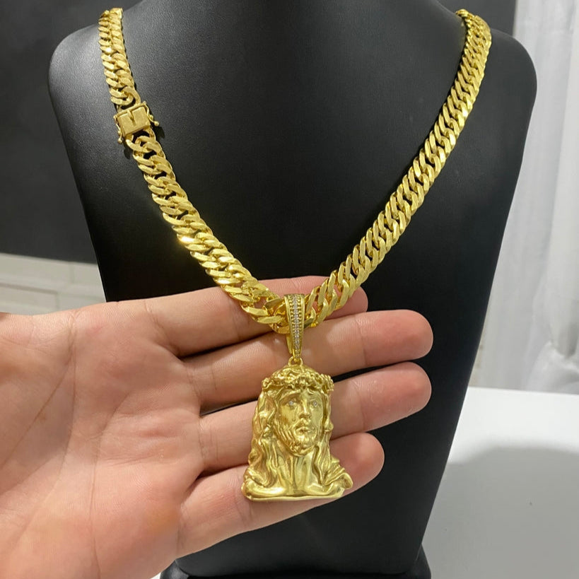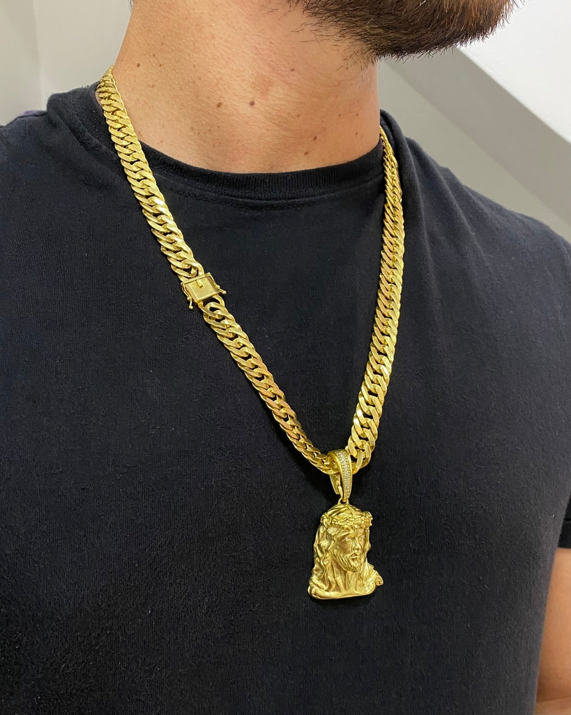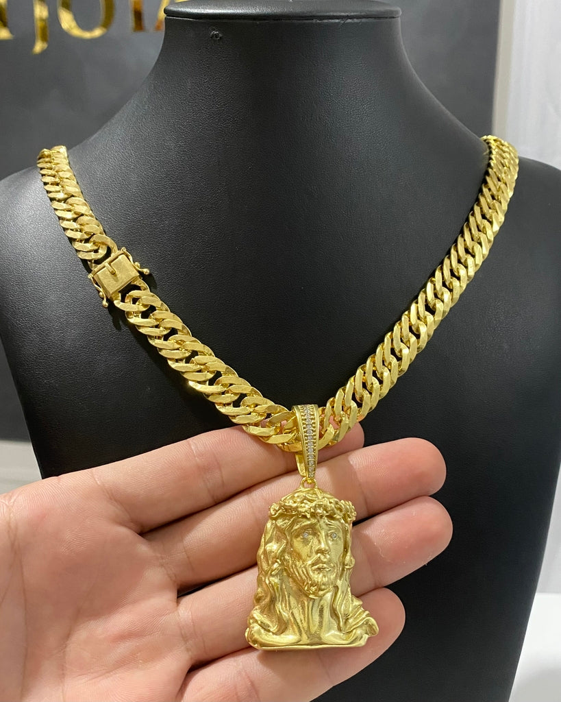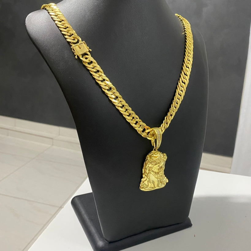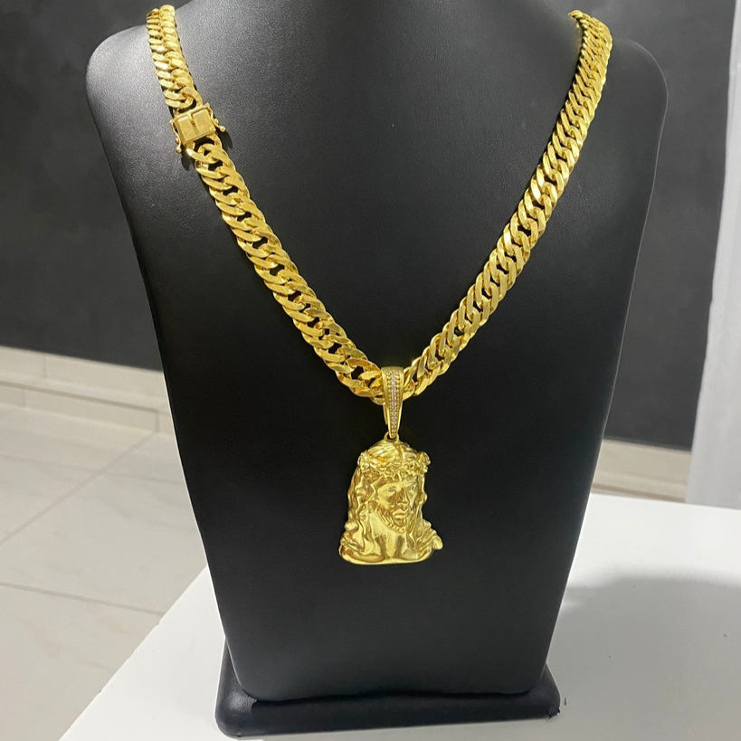 CORRENTE GRUMET LAMINADA 12MM + PINGENTE ROSTO DE CRISTO CRAVEJADO GRANDE