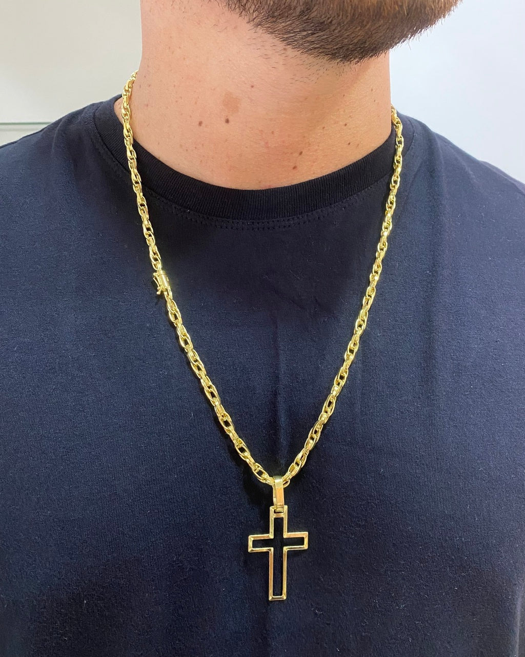 CORRENTE TIJOLINHO ELO DUPLO 5MM + PINGENTE CRUZ GRANDE VAZADA 3D