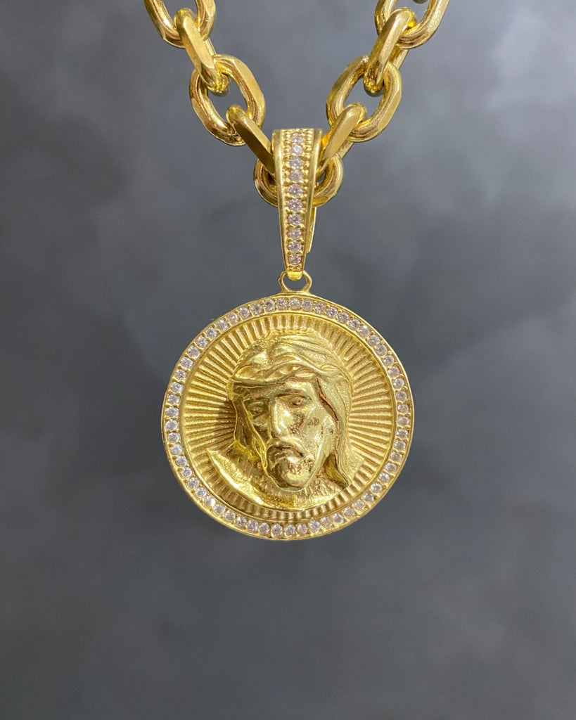 PINGENTE CRISTO REDONDO 3D COM BORDA CRAVEJADA - 3,2x3,2xm